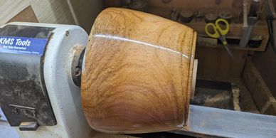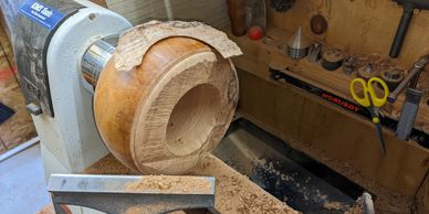 Determine the shape of the item you want and begin removing all the waste wood. You will need to create a tenon or a mortise for when you reverse the item to begin hollowing it out. You can see the end of the tenon to the far right of the bowl in this photo. That is grasped in the jaws of the chuck when the bowl is turned around.