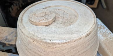 A tenon or a spigot is a protrusion at the bottom of the bowl that the jaws of your chuck will hold onto as the bowl spins on the lathe. In this photo the tenon has broken off the bottom of the bowl; a rare occurrence.